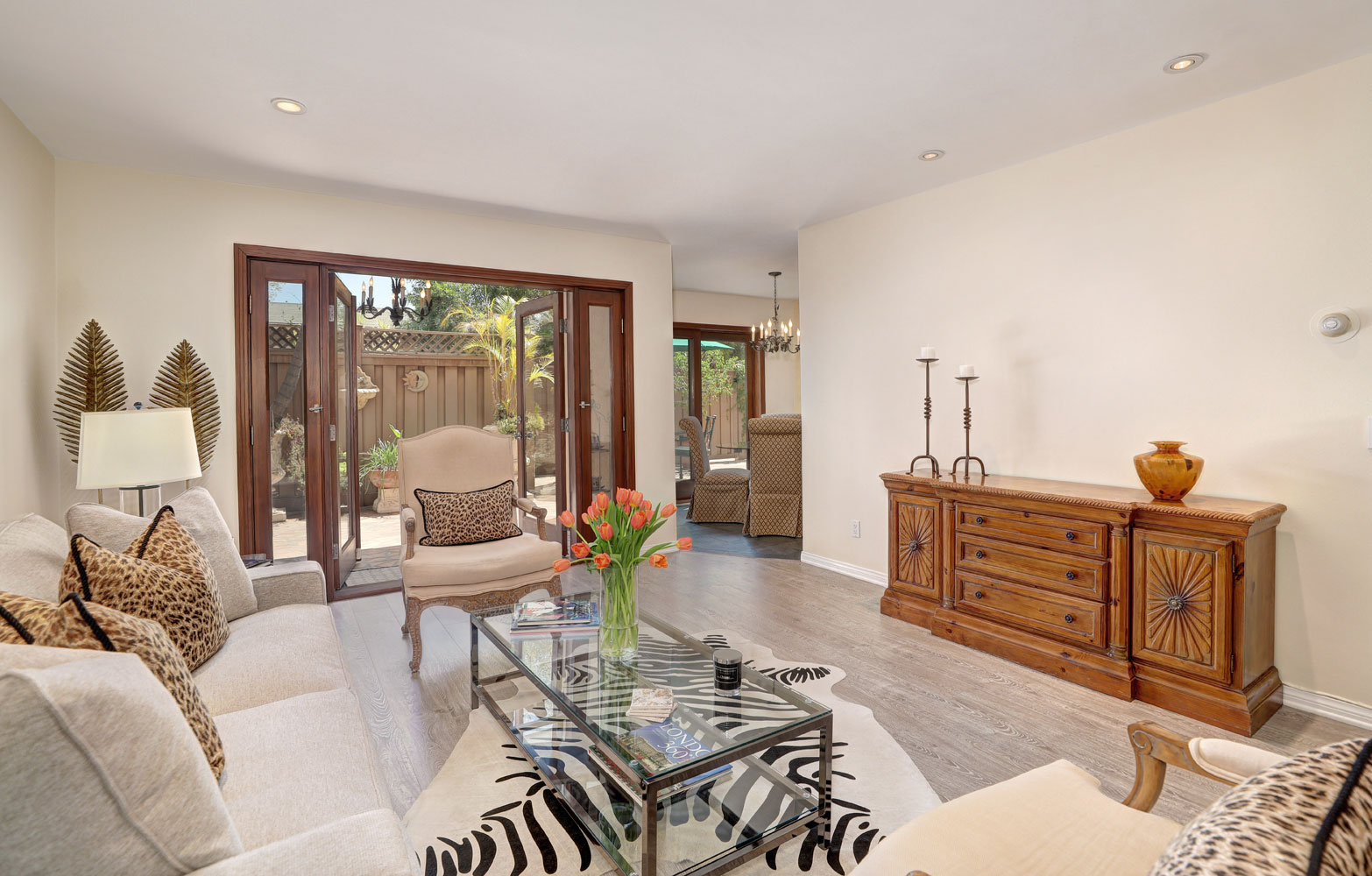 Huge Verdant Terrace, approx 650 sq. ft., runs the entire length of this spectacular European inspired condominium. Living room has French Doors to the patio and the Dining area also has a sliding door to the outside to enjoy dining Al Fresco or just relaxing in the California sunshine in this charming ground floor home. Remodeled rustic kitchen with quartz counter tops, recently new SS appliances and slate flooring. Bedrooms are on opposite sides of the unit with updated bathrooms and both bedrooms look out to the terrace. Security access building with 2 side by side parking spots. Building amenities include sparkling outdoor pool, rec room with pool table and table tennis. HOA includes Earthquake Ins, Water and Trash. In the center of West Hollywood close to Sunset Plaza with all the shops and restaurants.